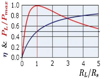 The graph here shows this power transfer relationship. The red line in that graph shows the amount of power supplied to the load. The number at the bottom showing resistance of the load divided by resistance of the power supply. When those two are equal (represented by 1, or the red vertical line), half the power goes to the load, and half the power goes to the power supply. This is where we achieve maximum power output.